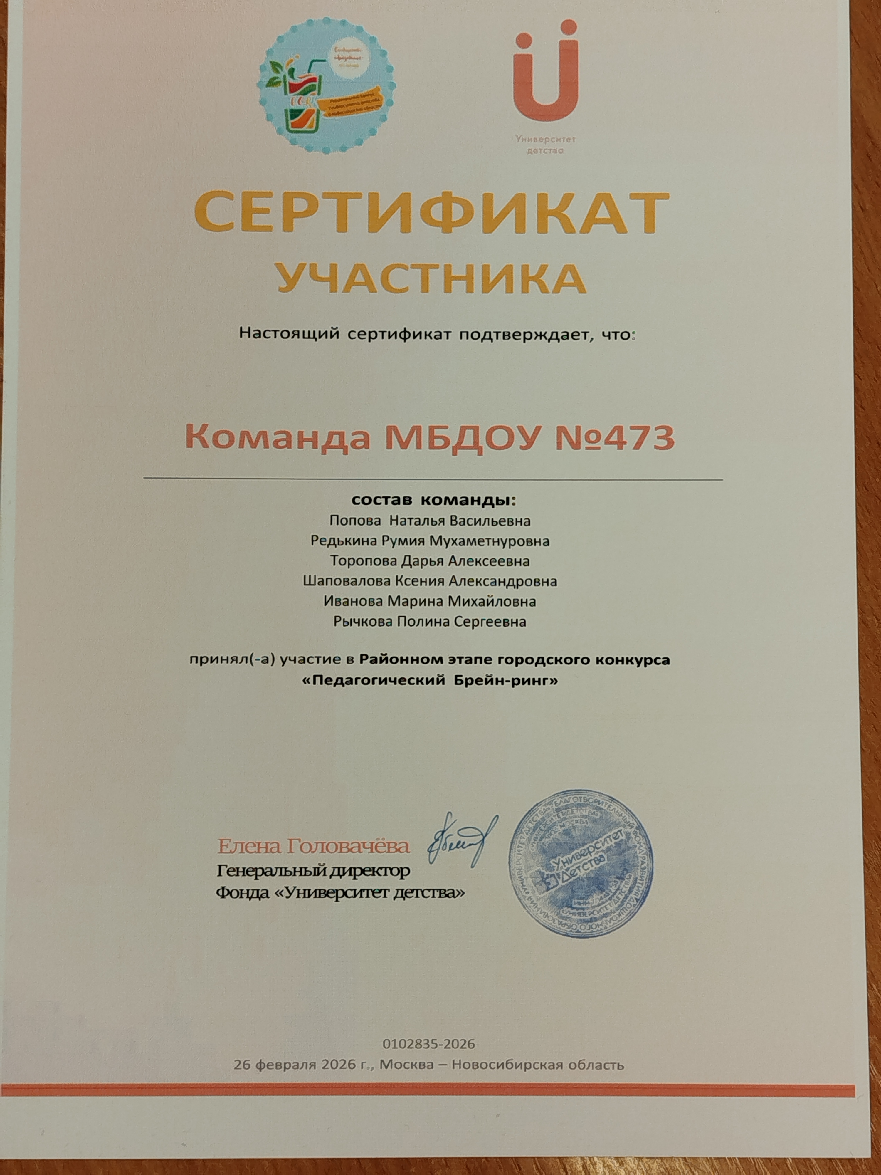 Сертификат участника в районом городском конкурсе "Педагогический Брейн - ринг"